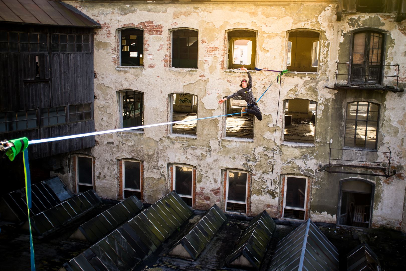 Nejvíc jsem toho natrénoval v Brně. Brácha koupil lajnu, která byla široká a hodně průtažná, tudíž šla napnout na chození a později i na hopsání. V parku Lužánky jsem tehdy potkal Michaela se Samem, jak tam drtí triky. „Nazdar, kluci, tyjo, teď jsem si taky koupil lajnu, nepomohli byste mi prosím?“ Pomohli. Založili jsme tým „Slack Rats“ a dva roky chodili trénovat do „našeho“ parku. Časem se nám podařilo sehnat starou halu ve Zbrojovce. Končil tam zrovna skatepark z důvodu nevhodných podmínek pro sportování – moc azbestu ve stěnách…to byl ideální prostor k tomu, abychom se tam nakýblovali! Po maturitě mě spíš než práce, nebo vysoká škola, zajímala lajna.